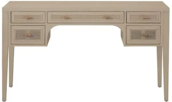 Lulu Coastal Beach Grey Oak Wood Woven Cane Panel 5 Drawer Desk