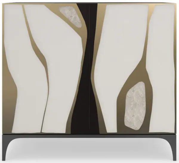 42"W x 18"D x 38"H Product weight: 144 lbs. With the utmost attention to detail, craft and functionality, this bar cabinet evokes the rhythmic flow of traffic in and around a city. Making a luxe statement: door fronts framed in a Chocolate Truffle lacquer and finished in a tactile mix of faux shagreen and Café Latte hand-printed resin with a Brushed Gold overlay. The mirrored interior offers ample space for keeping entertaining essentials, with an adjustable glass shelf and a single drawer for storing mixing tools and linens. Two touch latch doors with front pattern in Faux Shagreen, Chocolate Truffle and Café Latte with metal overlay in Brushed Gold and top finger pulls Interior features one drawer with Ombre Warm Silverleaf front and one adjustable glass shelf in Bronze Smoke glass; one drawer with front in Ombre Warm Silverleaf and soft close undermount guides; drawer interior in Dark Chocolate Case in Chocolate Truffle.; metal base in Tungsten; case interior in Ombre Warm Silverleaf Manufacturer's 1-year limited warranty, Wood case; metal base