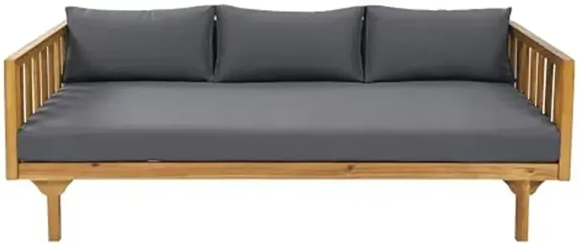 ACACIA WOOD: Made with acacia wood that brings a sleek and exotic look to your space, this durable hardwood naturally withstands outdoor elements and will not darken over time. Acacia wood is perfect as a solid, heavy frame that resists wear and tear. SLAT PANELS WITH STRAPPING BELT ACCENTS: The daybed features beautifully slatted seating, giving this piece a sophisticated, classic look. This pair perfectly pairs with the cross-back strapping belt accents, giving this set a wonderfully homey feel to your decor. WATER-RESISTANT CUSHIONS: Our cushions are covered with a non-porous material that makes cleaning any spill a breeze. Please note that these cushions are water-resistant and not waterproof. Please do not submerge in water. EXPANDABLE DIMENSIONS: Choose an accessory that is the perfect size for you and your furniture. This daybed is 65.00” W x 30.50” D x 27.25” H and opens to 82.00 inches when expanded. You will love how much your space can transform with the simple addition of this charming daybed. ASSEMBLY REQUIRED: Some assembly is required for this daybed. All of the instructions and tools needed for assembly are included.