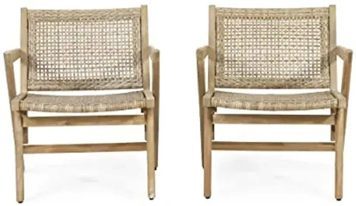 Outdoor Dining Chair Set of 2, 35 Inch Gray Woven, Brown Acacia Wood - Benzara