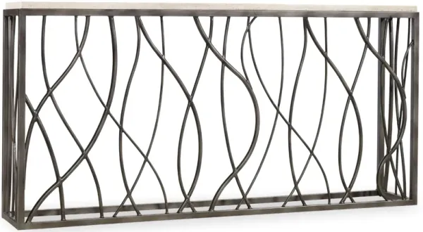 Organic and modern, this striking console table in a neutral color palette has a curvy steel base and natural stone top of Travertine Marble to create an inviting focal point.