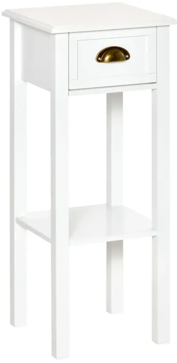 White Tall Nightstand: 2-Tier Slim Side Table with Drawer and Shelf