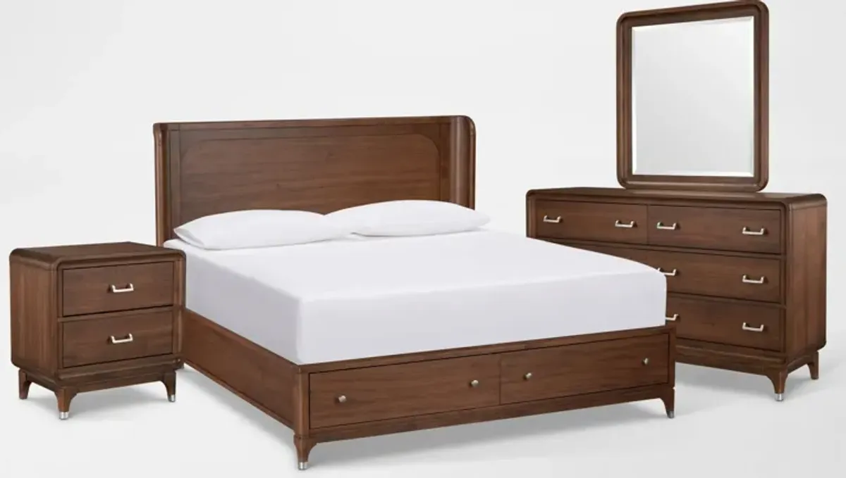 A stately addition to your home, the Lake Town bedroom features a high headboard and elegant picture frame moulding for a striking bed with subtle grandeur. The classic style makes it effortlessly blend into both contemporary and traditional rooms, depending on present decor. Crafted with acacia veneers, a dark gray finish ensures its versatility throughout the years. Wire-brushing along the painted surface and round metal knob hardware adds a touch of charm to this warm, inviting collection. Mattress and foundation (if required) sold separately. Bed shown is queen size.