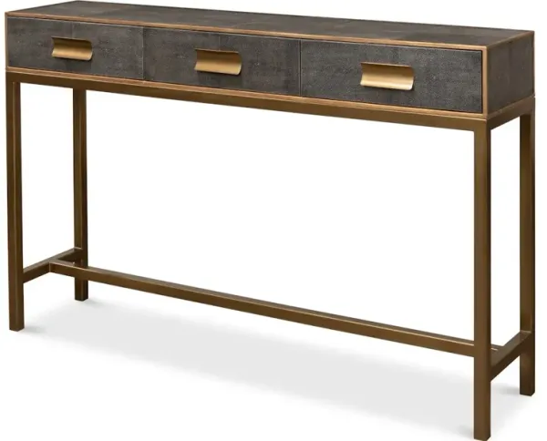Levi Mid Century Modern Grey Shagreen Leather Brass Accent 3 Drawer Console Table