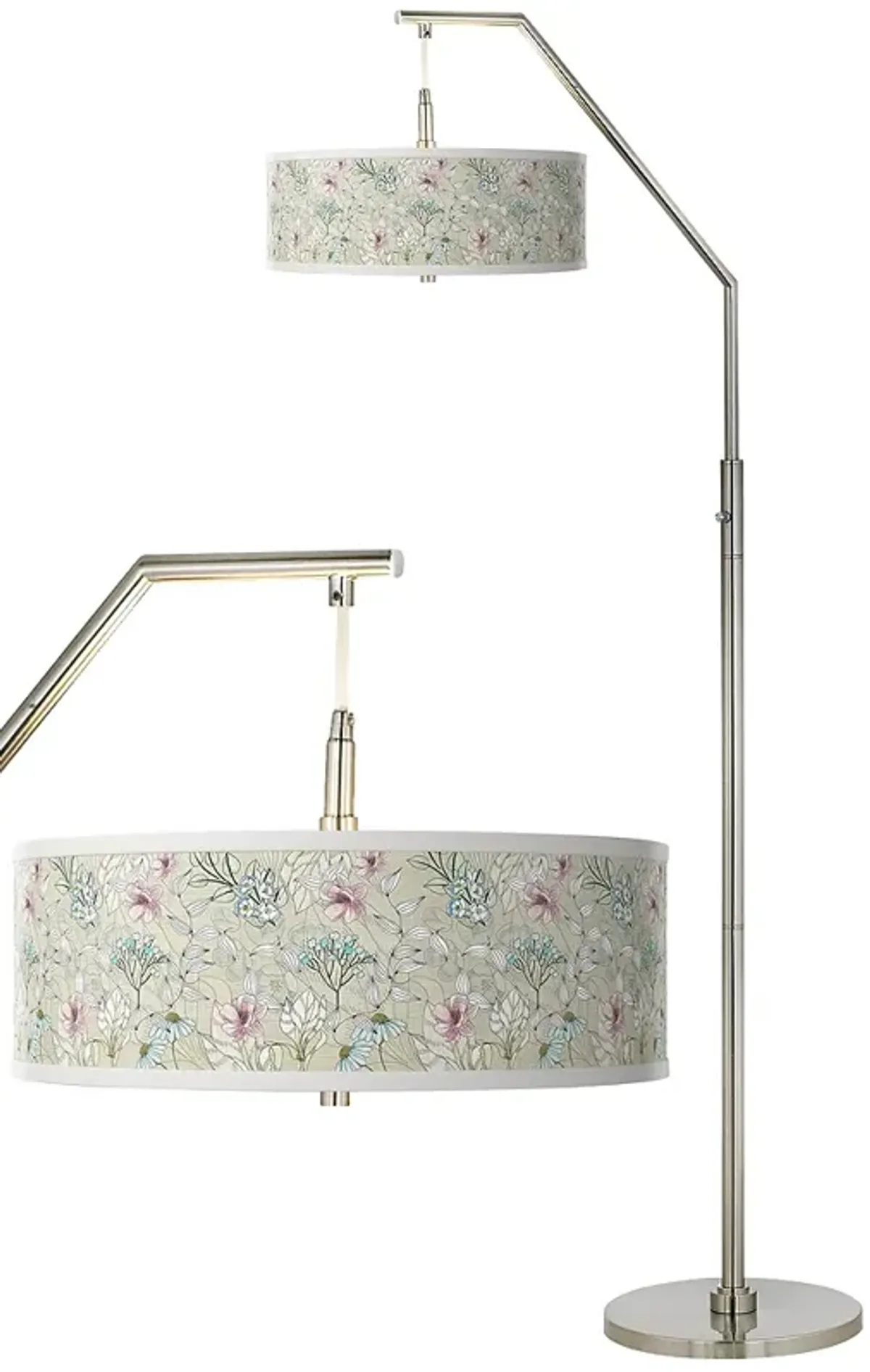 This floor lamp's contemporary good looks are matched by its practical design. The custom made-to-order shade features a plastic diffuser at the bottom to prevent glare. The Lucrezia patterned shade is printed with the same technique used in reproducing museum-quality artwork. The base features a sleek, brushed nickel finish. Shade printing process U.S. Patent # 7,347,593.