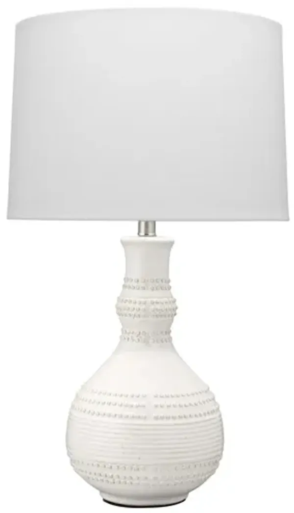 Delicate raised knobs on the ceramic lamp body of the Qualer Nest lamp are reminiscent of the first drops of a summer rain, gently landing on the sidewalk. The raised pattern circles around the lamp body and is subtly broken up by a gentle ripple-like pattern to continue the water influenced design. Pairing this white table lamp with a monochromatic lamp shade is the perfect way get washed away by this casual design. Partial assembly may be required.