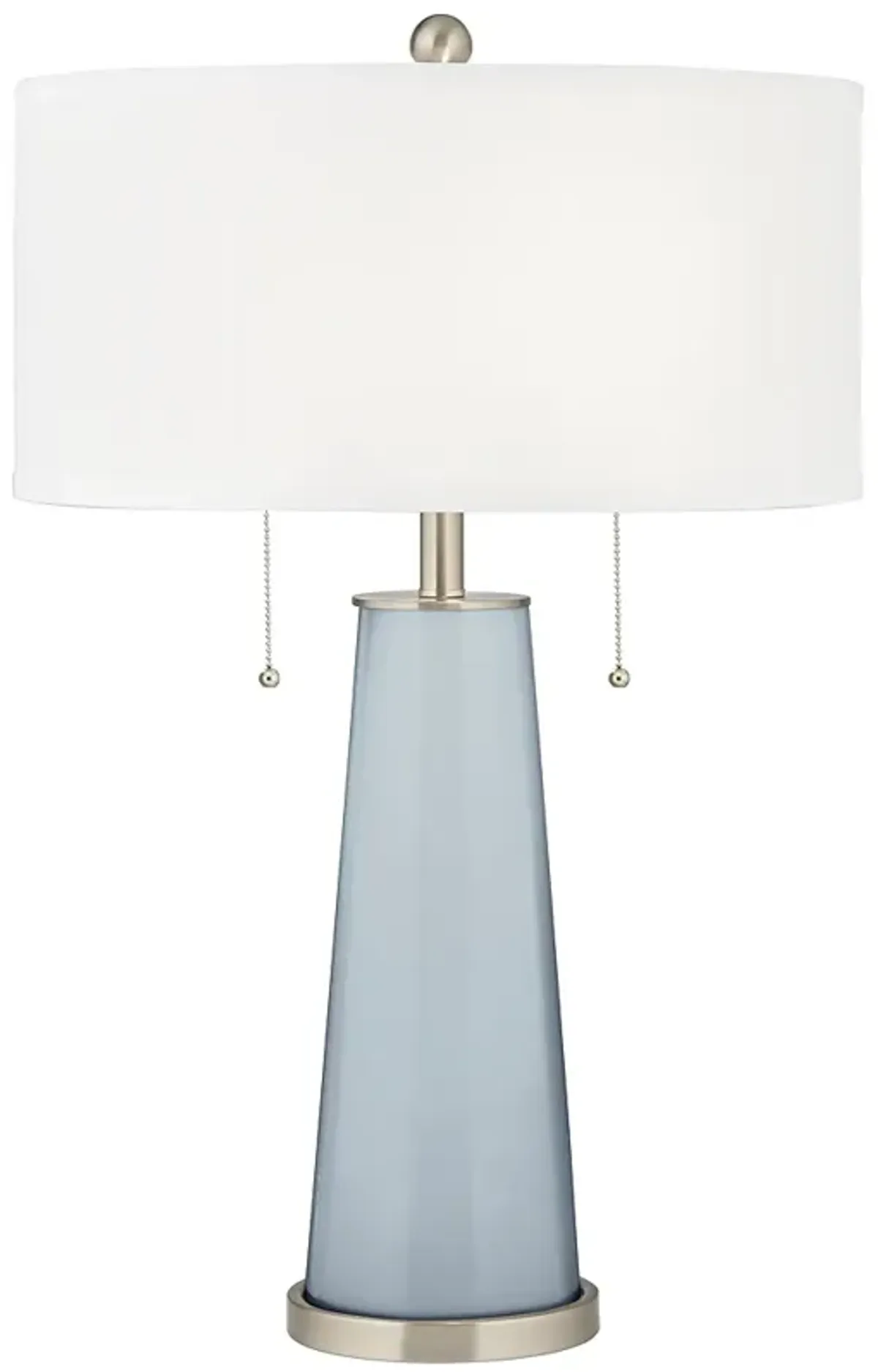 Brighten your decor with color from this tapered glass column table lamp from the Color + Plus collection. This lamp features the designer Rain blue gray finish on the base, perfect for adding a pop of color to your decor. Metal accents are in a brushed nickel finish, and up top is an off-white drum shade that completes the look.