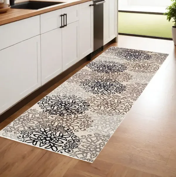 8' Floral Medallion Stain Resistant Runner Rug - Tan Gray And Black