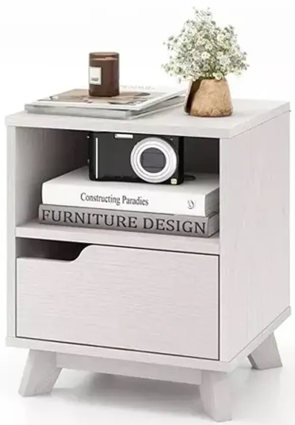 Mid Century Modern Bedside Table with Storage Drawer and Open Shelf-White