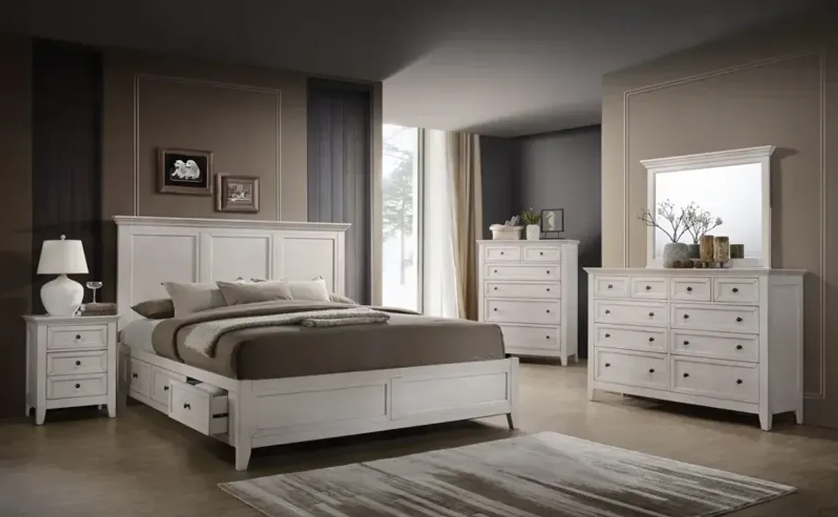 Jamestown Storage Bed, Dresser, Mirror & Nightstand in White, Queen