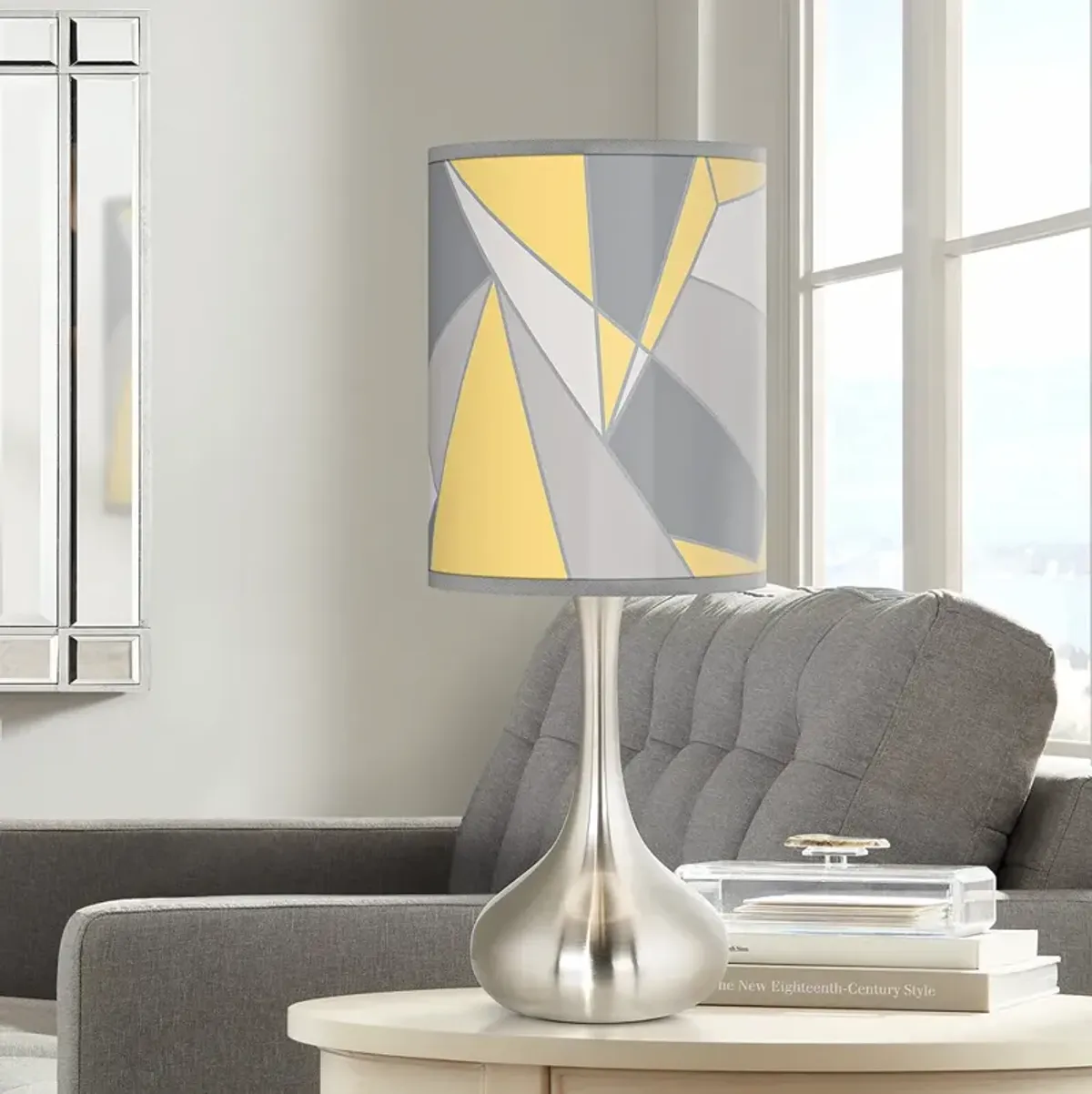 Refined simplicity is yours with this modern table lamp design. The metal base offers a graceful sculpted shape that's presented in a brushed nickel finish. Topped with a giclee cylinder shade that's custom printed with a stylish Tiffany-Style Lily pattern. Please note, the shade uses a printed pattern and not actual glass. Shade printing process U.S. Patent # 7,347,593.