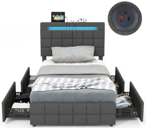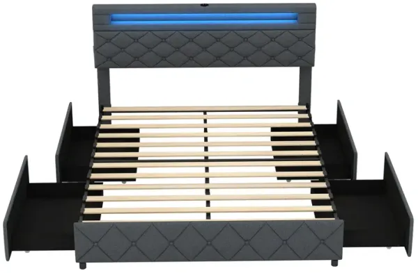 LED Bed Frame Full Size with 4 Drawers and Charging Station