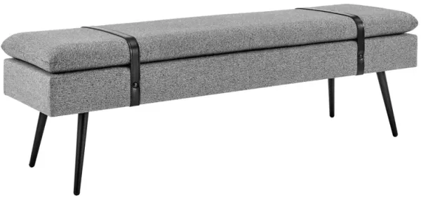 The rectangular shape bench with firm seating cushion features black faux leather straps on soft gray upholstery, providing convenience and chic accent in one. Splayed steel legs bring sturdiness and durability. In retro elegance, the Zuney bench adds style and function wherever and whenever extra decor or seating is needed. This bench is generous in size 55" x 16". Highlights include decorative faux leather strap, firm cushion on high density foam on Gray tone upholstery on tapered legs for a Mid Mod vibe. Easy assembly, available in Princeton Gray. . Seat Dimension: 55 x 16. Seat Height: 18. Type of Packaging: Rectangular: ISTA 1A
